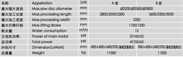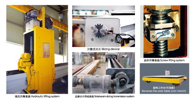 SQC-2200/2500/2800 uses inverter to controlleft-right feeding adjusts the speed according to the stone material.It uses hydraulic lifting system (screw lifting system*optional0,forward-backward slicing uses high-precision screw nut driving,automatic slicing,main spare parts adopt imported good-quality materialsl;the bloch can be placed in the ground dire ctly to save worktable and its maintenance costs;Thus the whole machine is featred as high cutting granite and marble block with high wave